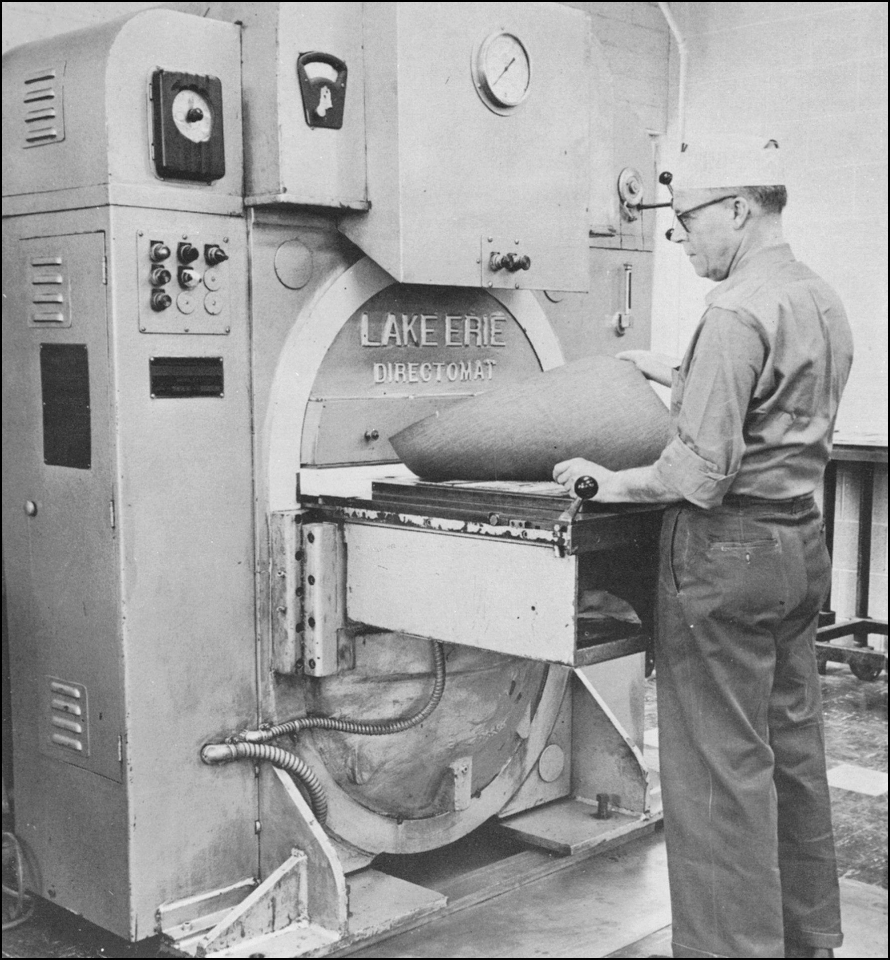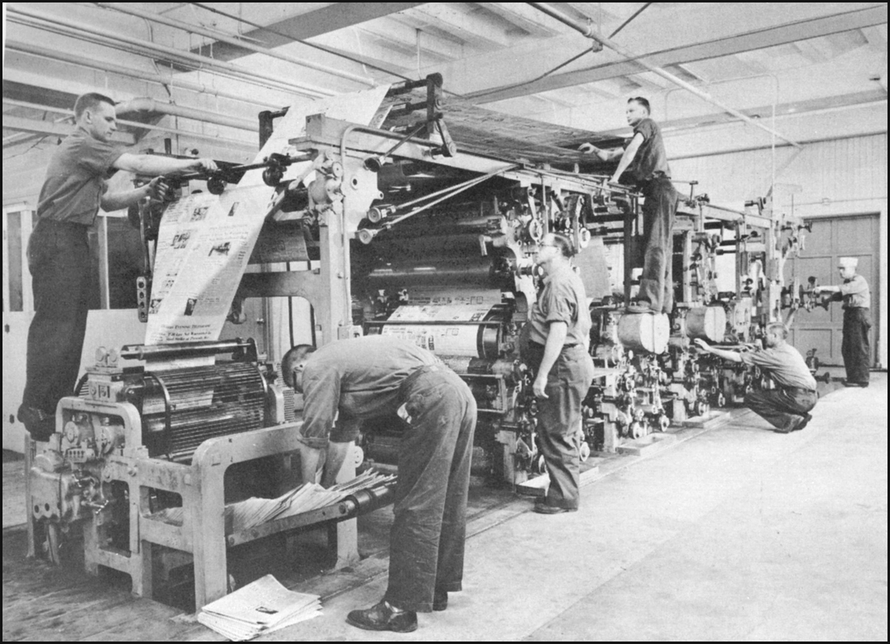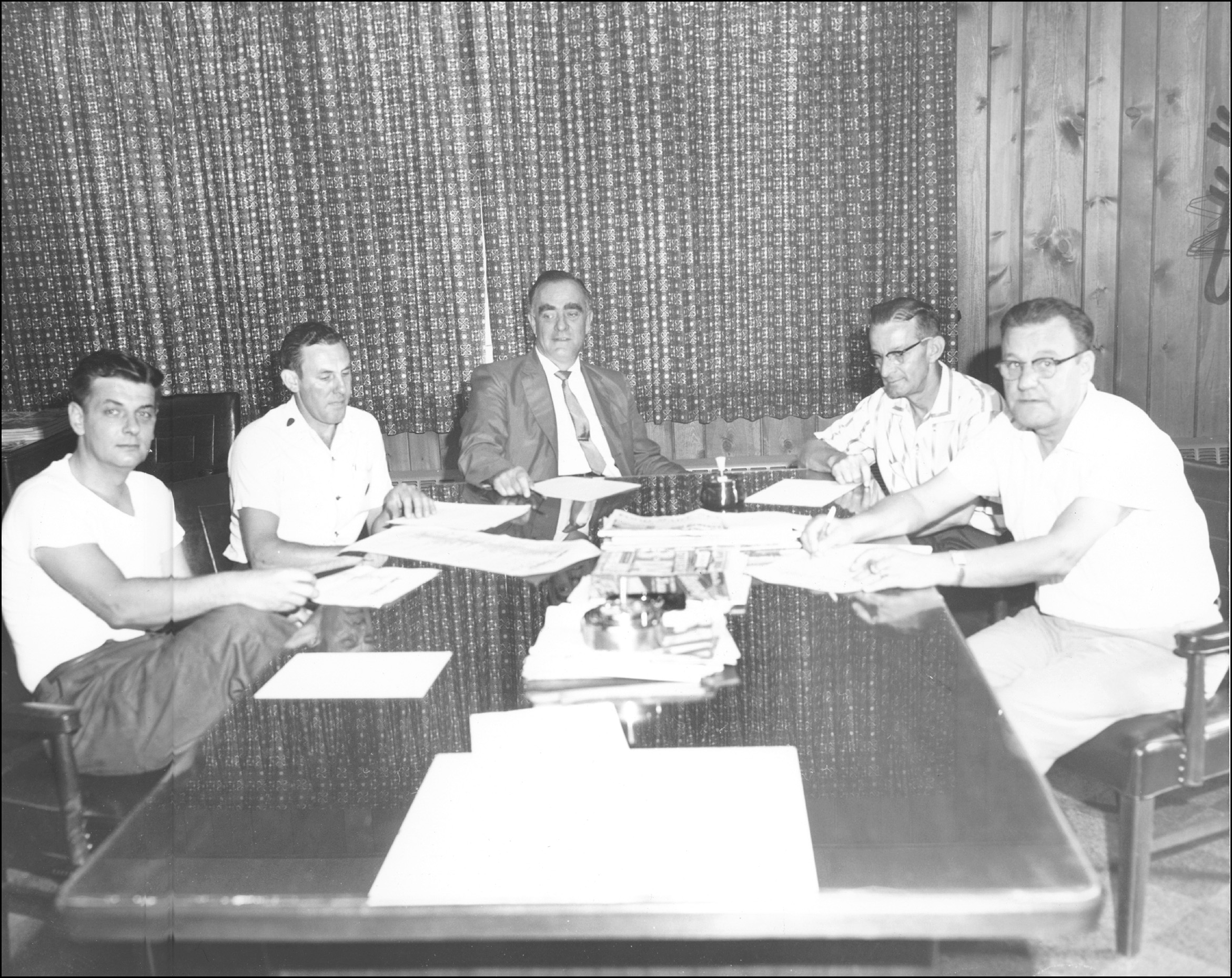The Dixon Publishing Company, circa 1959, is under the direction of Douglas Shaw, general manager (center). To the left are: Clyde Cooley, sterotyping foreman, and Albert Halstenberg, pressroom superintendent. To the right: Al Berner, engraving department superintendent, and Joe Burge, composing room superintendent.