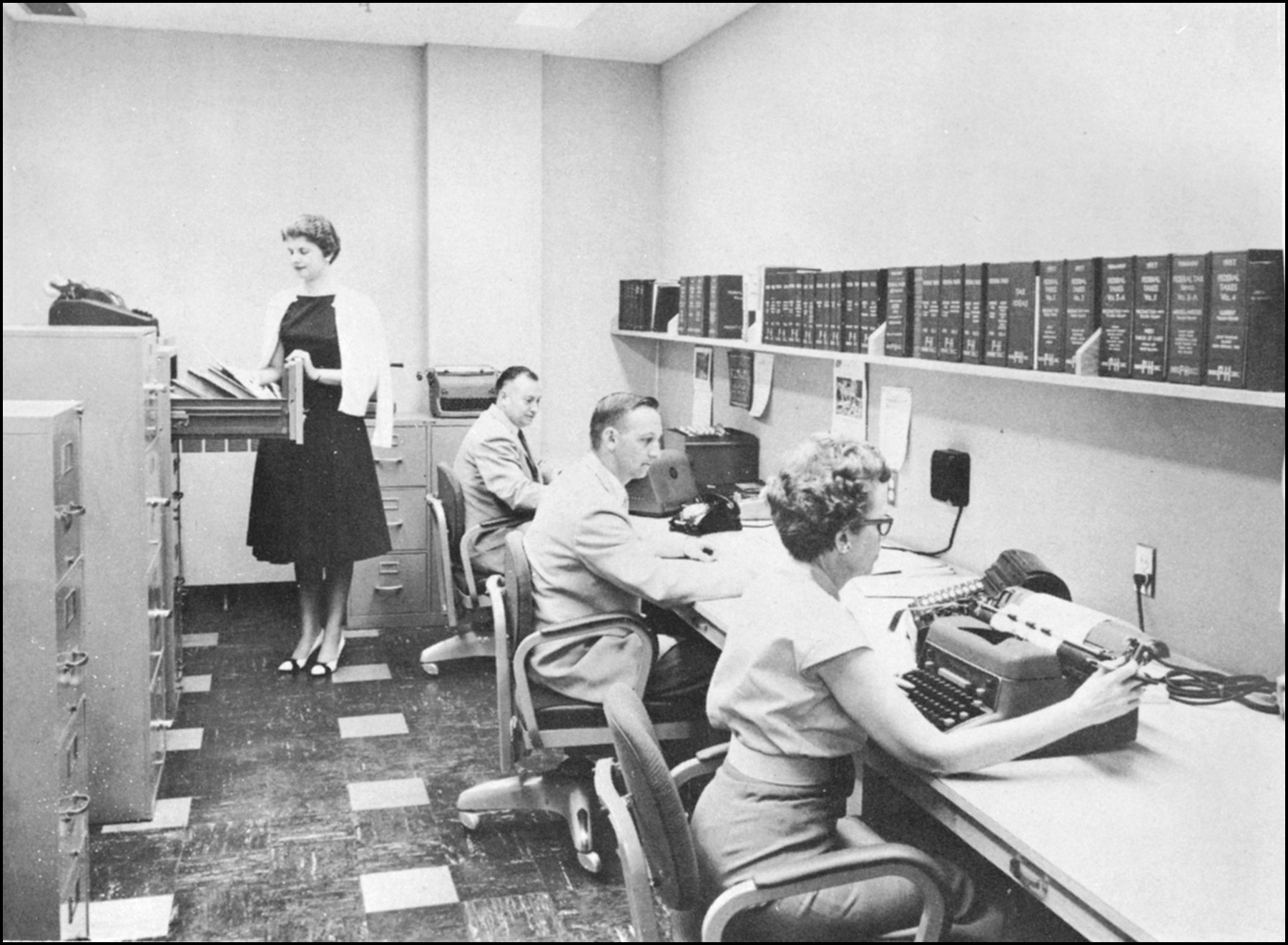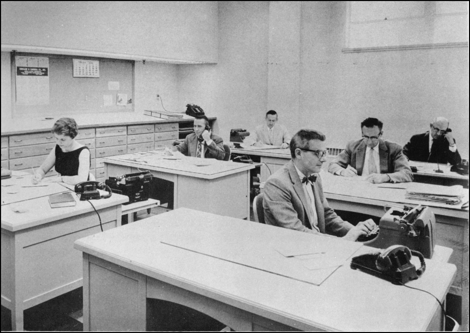 A staff of accountants and auditors occupied this office and processed all financial matters related to the Dixon Evening Telegraph, and also to those of six other newspapers which comprised the Shaw newspaper group. Circa.1959