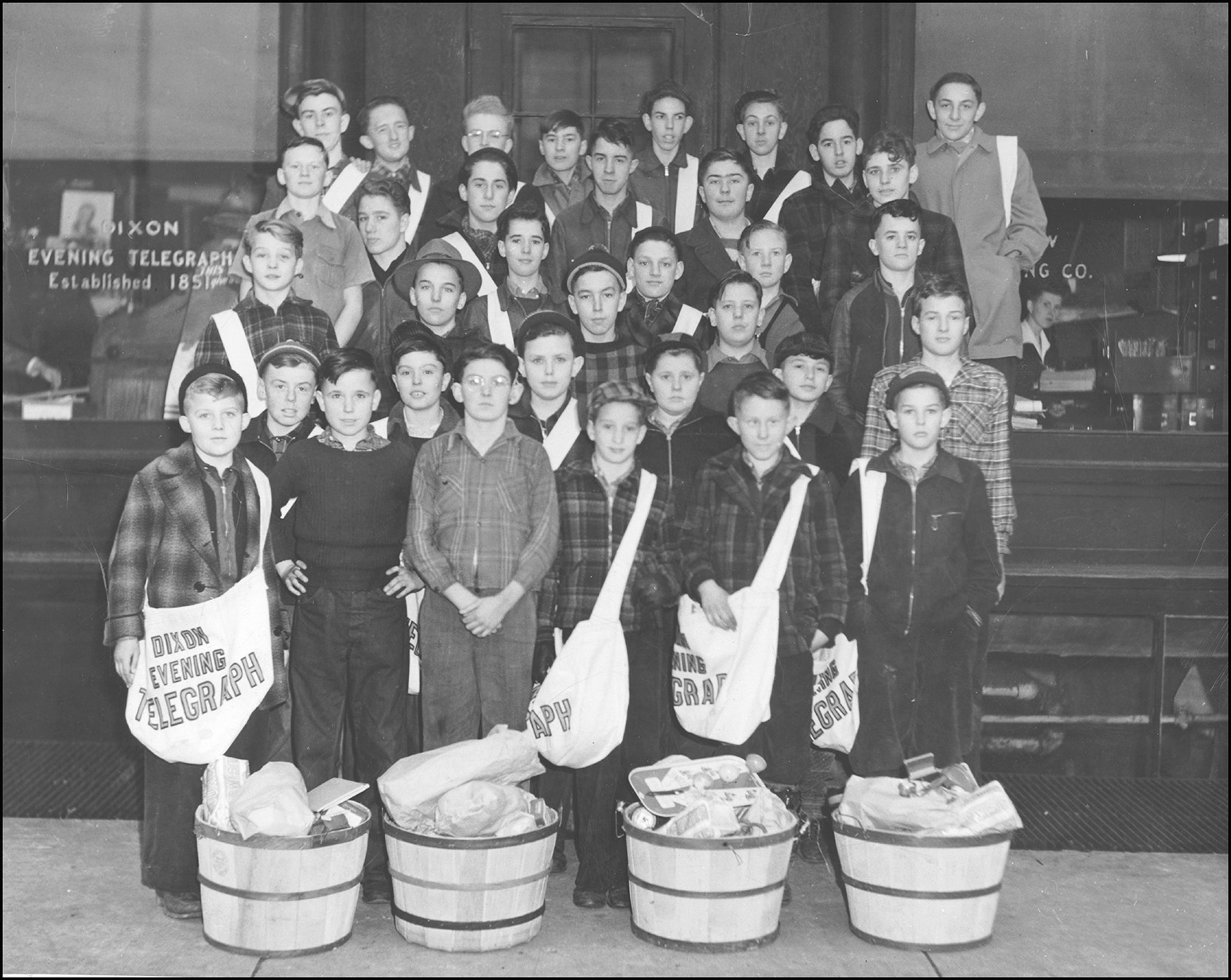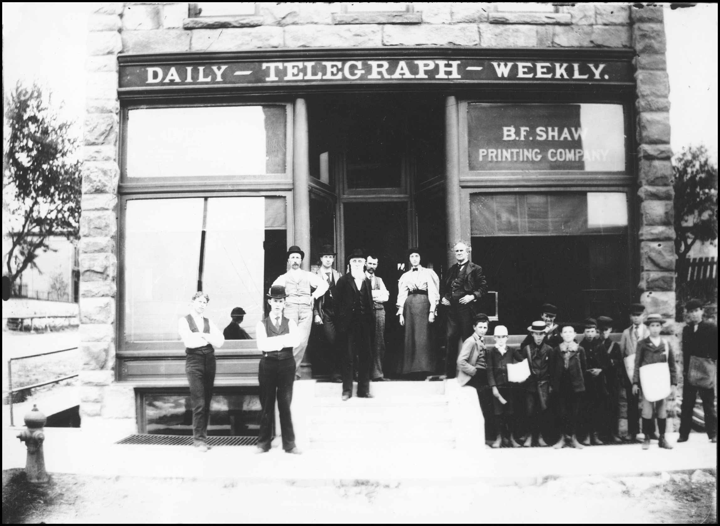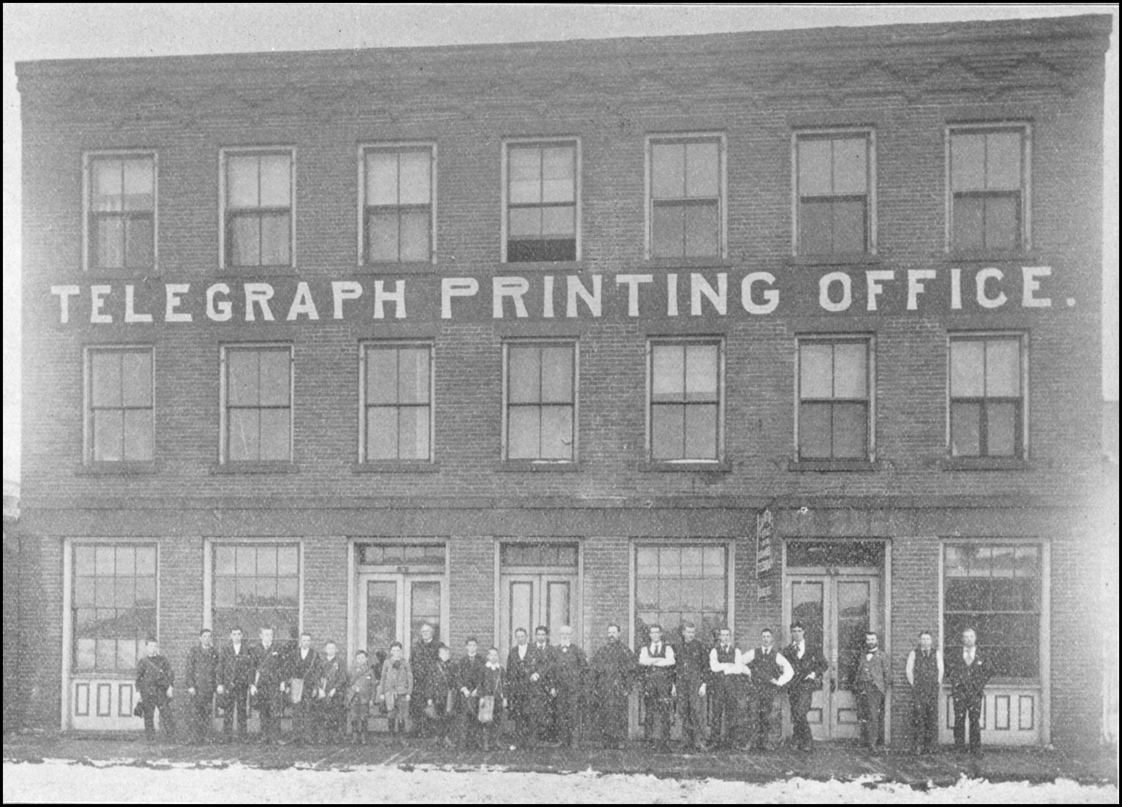 The Dixon Evening Telegraph building on First Street. The enterprising staff turned out both a daily and weekly Telegraph in the 1880s and ‘90s when Editor B. F. Shaw (to right at rear) suddenly responded to increasing demands of the growing Dixon area in 1883 by publishing The Evening Telegraph in addition to the weekly Telegraph, which was later discontinued.