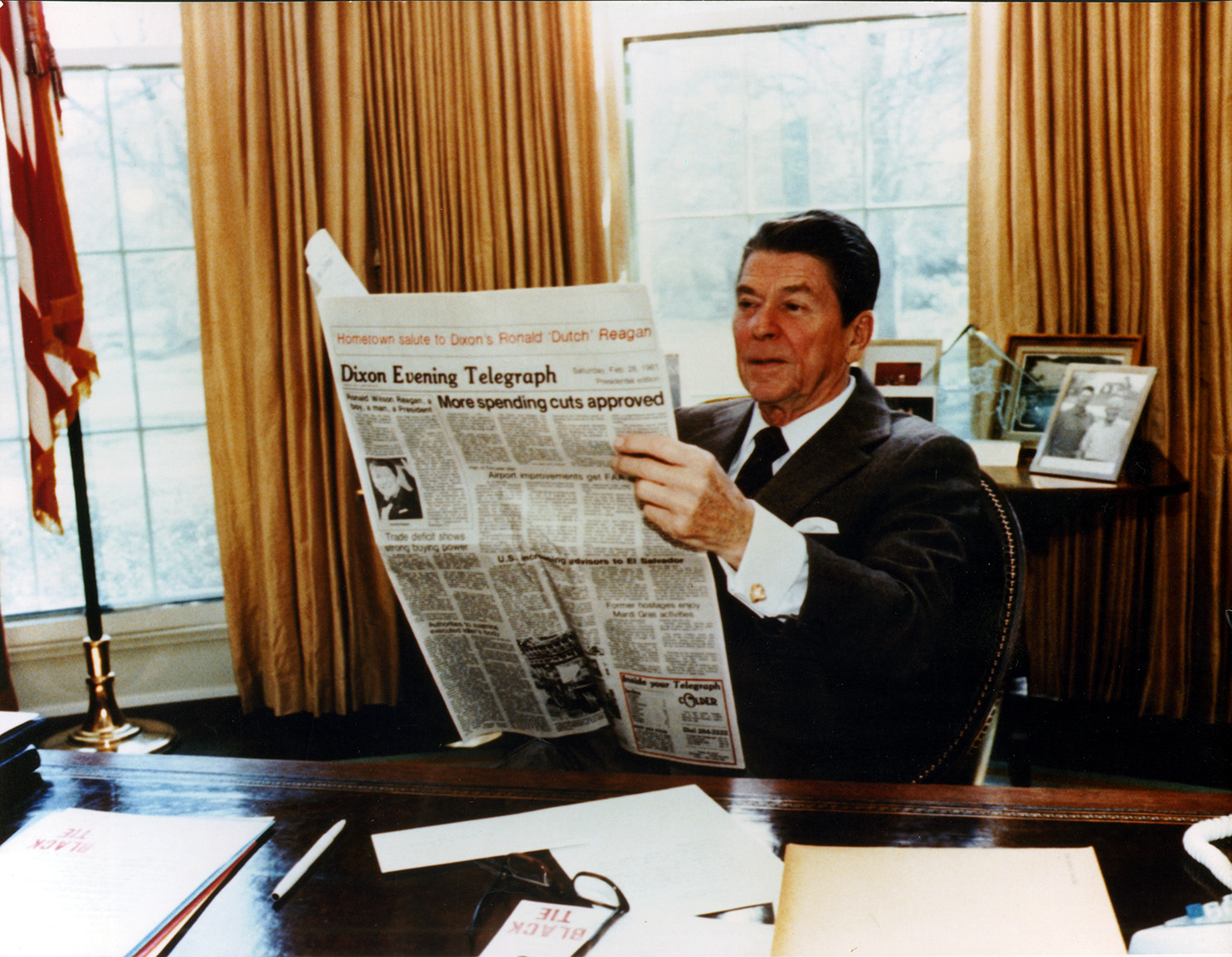 President of the United States, and former resident of Dixon, Ronald Reagan, reading the February 28, 1981 special edition of the hometown paper, which featured him, in the White House Oval Office.
