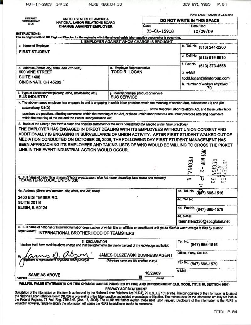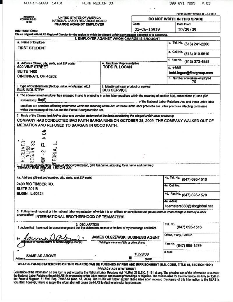 Pete Perez, deputy officer in charge for the Peoria sub-regional office of the National Labor Relations Board, said Local 330 filed two charges Oct. 29 against First Student and a third Nov. 2.