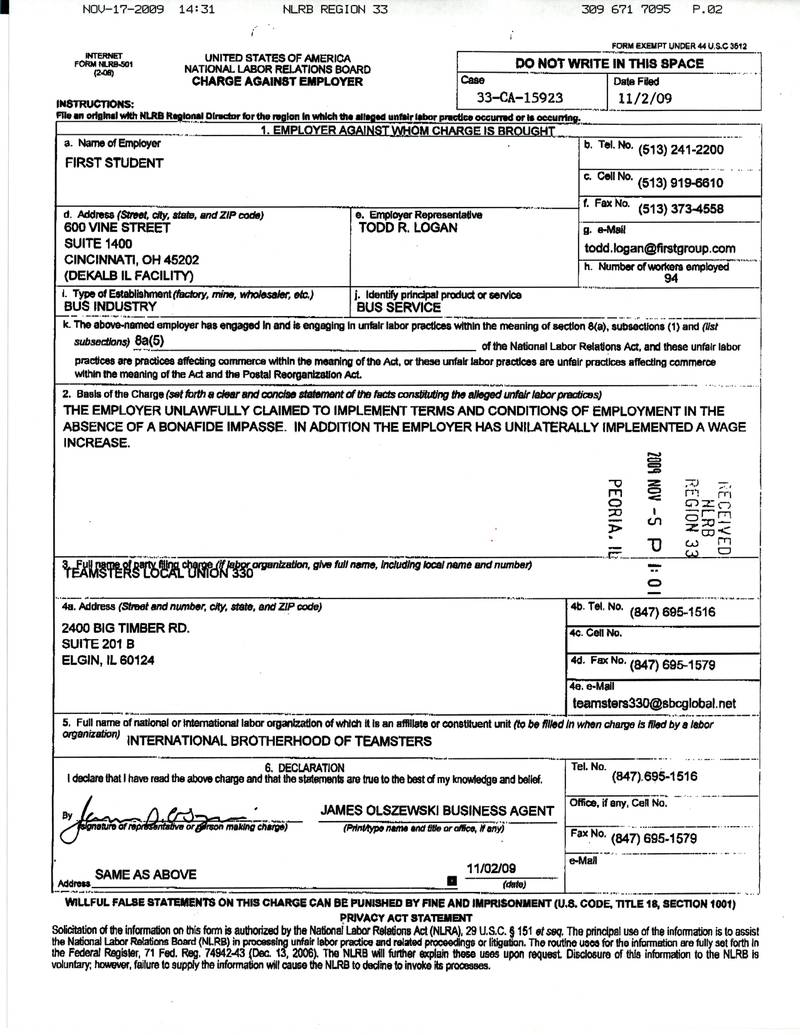 The charge filed Nov. 2 said that First Student "unlawfully claimed to implement terms and conditions of employment in the absence of a bona fide impasse. In addition the employer has unilaterally implemented a wage increase," according to the filed charge.