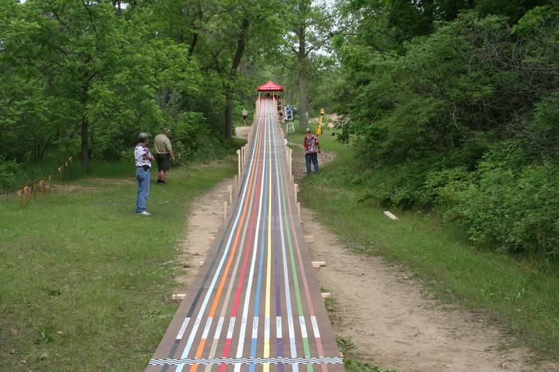Thirty-five separate sections of plywood eight feet by four feet in length made up the track, said Rich Przybylski, who helped in the building efforts.
