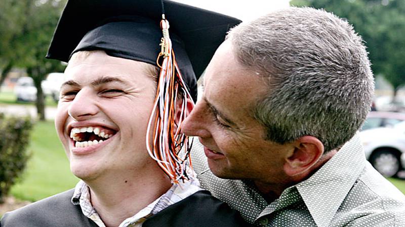 Graduate Andrew Mason, who has Angelman syndrome, received cheers and applause from the entire crowd as he was helped across the stage Sunday to receive his diploma.