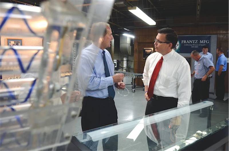 He met with the Frantz executive team before touring the bearing factory. He spoke with employees in the factory’s assembly room, press room and screw machine department.