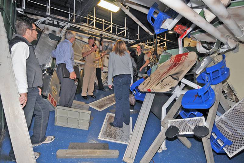 The trainers were told how lessons learned from actual events in recent Navy history -- the terrorist attack on USS Cole (DDG 67) in Yemen in 2000, mine damage to USS Tripoli (LPH 10) in Desert Storm in 1990 and the missile strike on USS Stark (FFG 31) in the Persian Gulf in 1987 -- have been incorporated into the scenarios aboard Trayer that range from simulated missile attacks that can cause fires to flooding caused by exploding undersea mines. The training also simulates conditions similar to historic at-sea mishaps, like the fire on the flight deck of USS Forrestal (CV 59) in 1967.