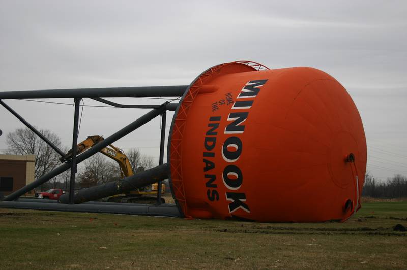 The old water tower was outdated and too small for village use. Icing around its base from last winter created concerns about the tanks storage ability. It's estimated to be 75 to 85 years old. Minooka is the second owner.