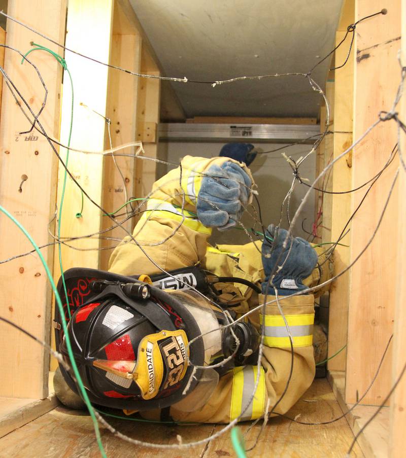 It simulates most of the hazards firefighters can face in a house, including collapsed spaces, walls with electrical wires going through and cramped spaces they may find as they work their way through a room filled with large furniture.