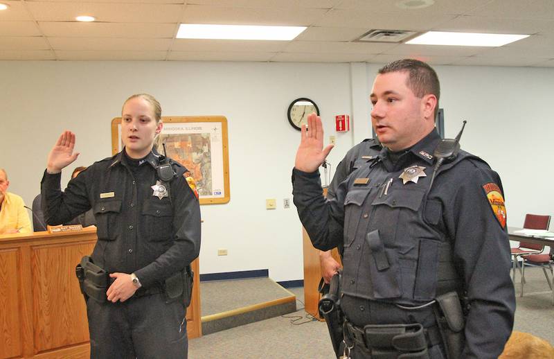 Two officers were sworn in this week as Minooka police officers. The job is officer parrish’s first police officer role. She is a 2005 graduate of Reed Custer High School, and she has previously worked as a security guard.