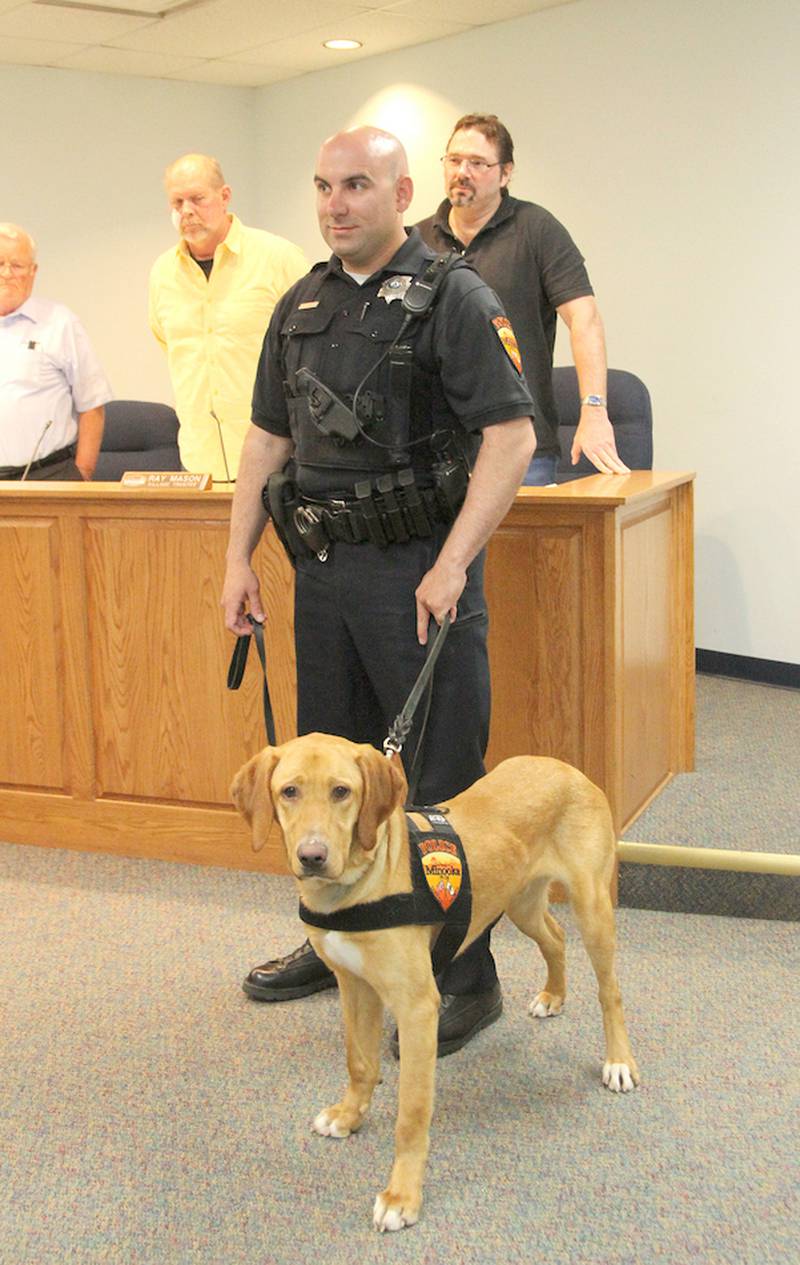 Grundy County State’s Attorney Jason Helland, who conducted the ceremonial swearing in at Monday’s Minooka Village Board meeting, said the cost of the dog and training was $13,500, with the cost being paid for through the 12.5 percent the State’s Attorney Office received back from drug forfeitures last year.