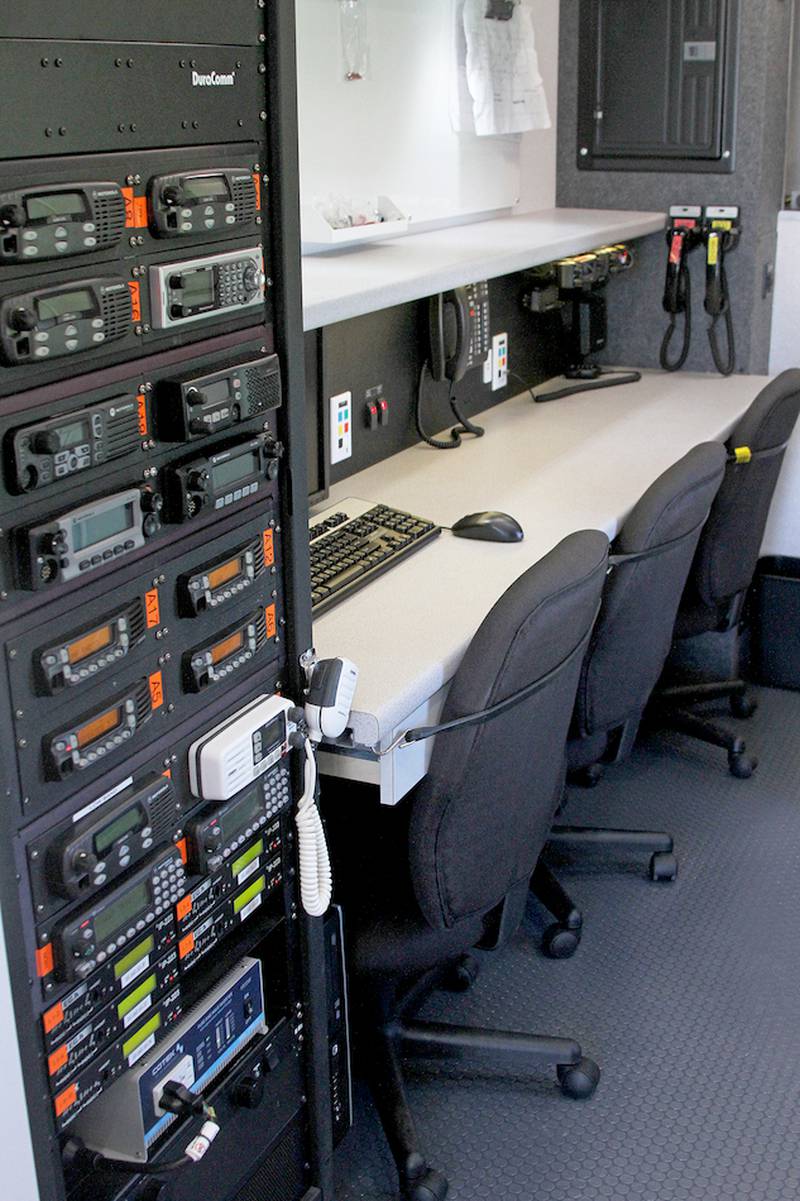 The new command vehicle is equipped with computers, radio phones, a global information mapping system, a radio tower and a small conference space.