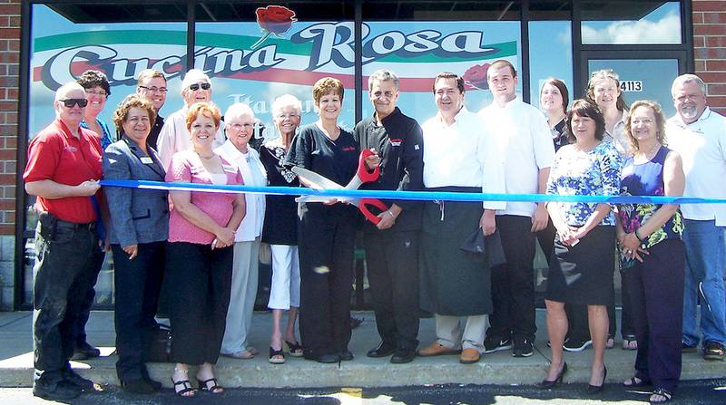 The McHenry Area Chamber of Commerce recently hosted a ribbon-cutting ceremony with Cucina Rosa Italian Restaurant, 4113 Shamrock Lane, McHenry. Pictured (front row, from left) are Kurt Rice, A Better Water Treatment Co.; Denise Netzel, Tend 2 Corp.; Gina Kappler, The Gum Gal; Betty Burke; Kathy Hegarty; Mary Jo and Salvatore Savanelli, owners of Cucina Rosa Italian Restaurant; Jerry DeNunzio; Joe Burke; Danna Gawron, BMO Harris Bank; Suszan Worzala, Letizia Financial Group; and Todd Lowenheim, Lowenheim Insurance Agency. Pictured (back row, from left) are Anita Camara, Porte Brown, LLC; Doug Martin, McHenry’s deputy city administrator; Joe Burke; Sam Miller; and Lori Boyle, BWB Graphics & More.