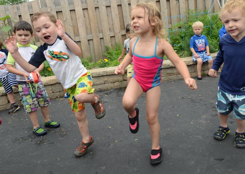 Mona Webber and Naffziger's toddler-age classes received missions that helped them touch base with their bodies and their environment. Naffziger's class, who already were taking advantage of a perfect summer day with a beach-like activity, took some time to complete their exercise, which entailed jumping in five different ways, while Webber's class went on a short nature hike around the academy's garden and playground to collect five nature items.