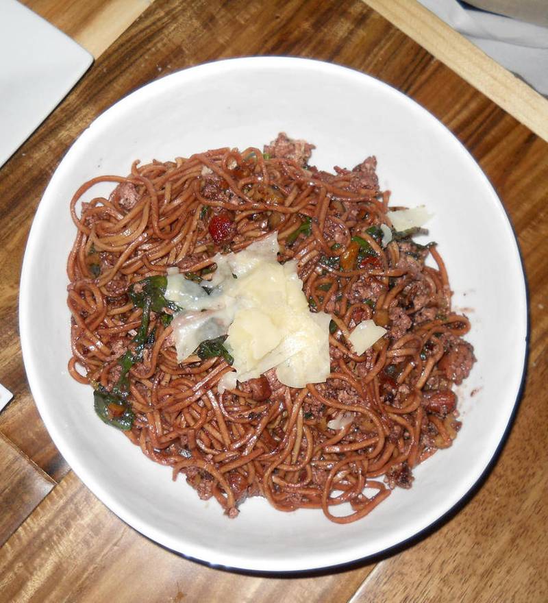 My dining companion and I decided to share pasta and meat courses as our entree, and couldn’t resist trying the drunken spaghetti, something entirely new to us and labeled a house specialty.