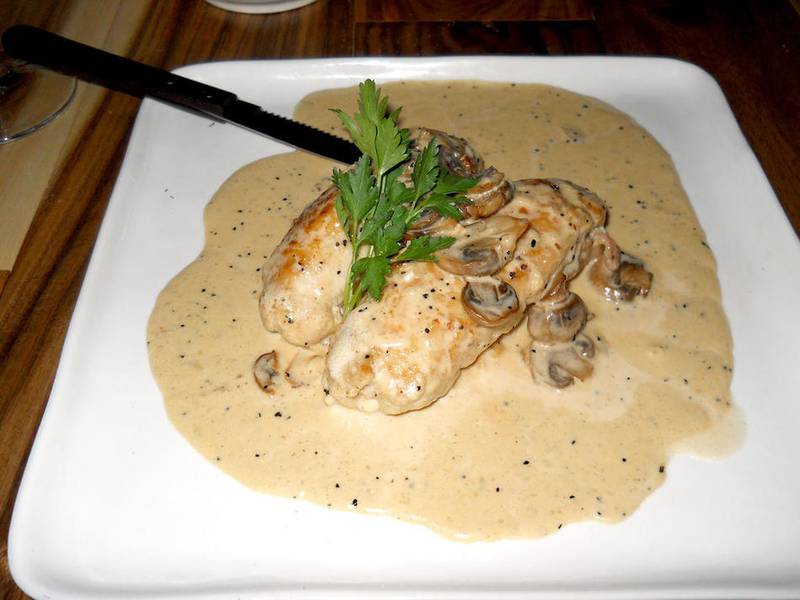 Our other entree choice was a juicy, farm-raised chicken breast stuffed with prosciutto, fresh sage and fontina, and bathed in a decadently creamy brandy sauce, with ample extra. None was left behind.