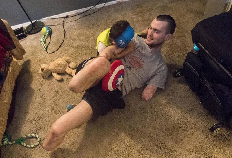 “My arms aren’t fun to untangle, with all these cords and wires,” Ethan Menges said as he stood next to his electric wheelchair in his bedroom, while his 3-year-old nephew and 6-month-old black Labrador retriever rolled around the floor.