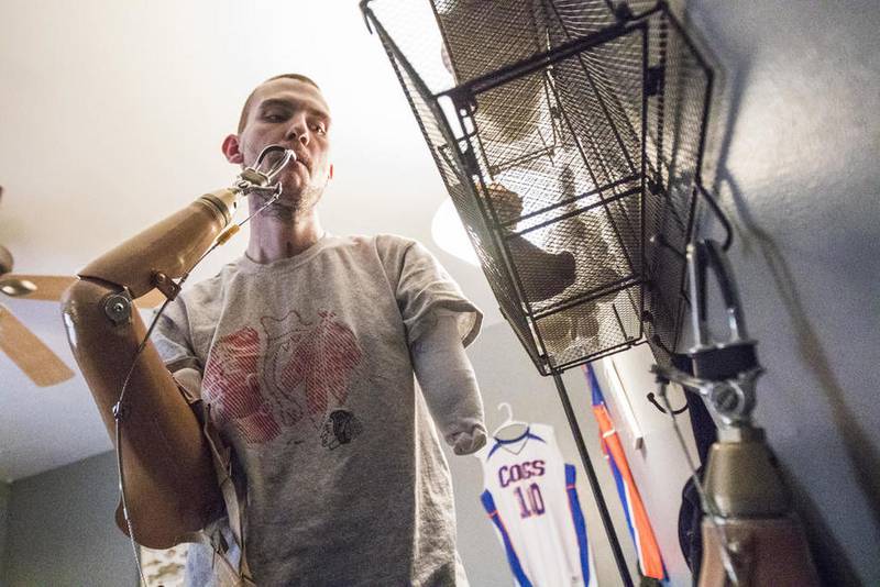 “Whenever I have my hands on, I sometimes just sit there with them like this,” he said, smiling as he turned his prosthetic hand backwards.