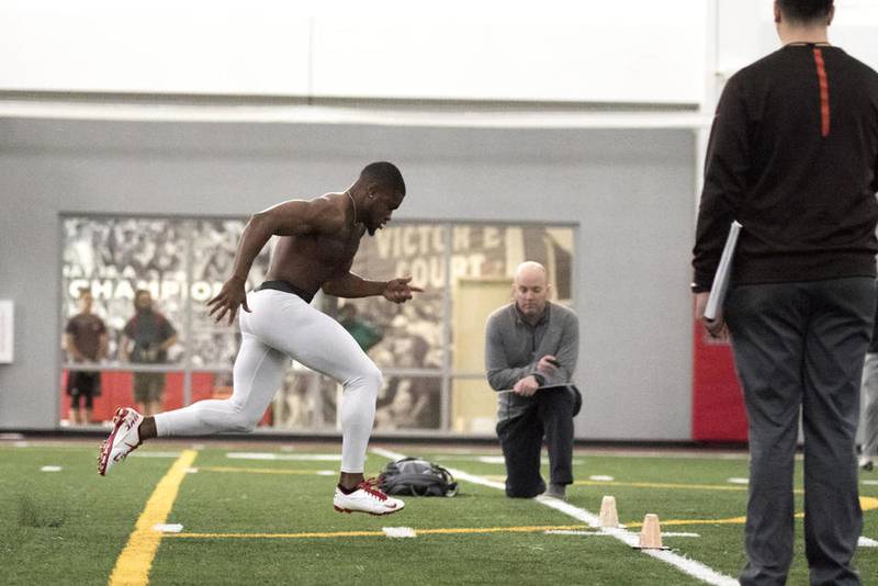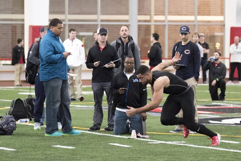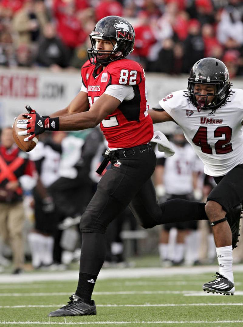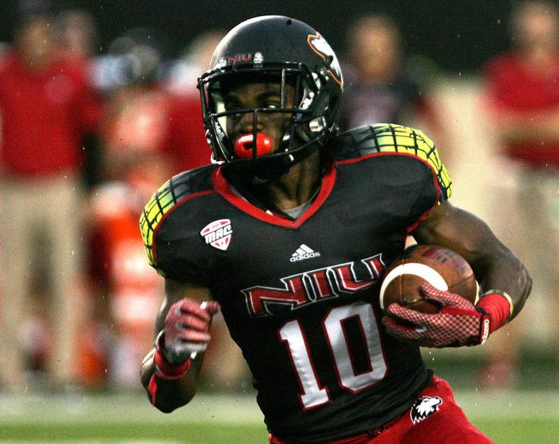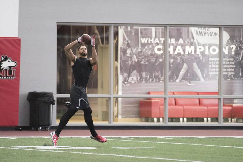 The former Northern Illinois football star joined a handful of Huskies as part of the school’s Pro Day on Friday afternoon at the Chessick Center, with about a dozen NFL scouts watching with stopwatches while the speedy receiver did his 40-yard dash.