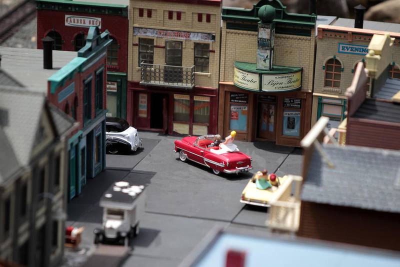 The scenery includes die-cast postal cars, Illinois Bell cars, handmade elevated wooden bridges, a 1950s diner, industrial area, greenhouse, chapel, gunsmith, car accidents and more.