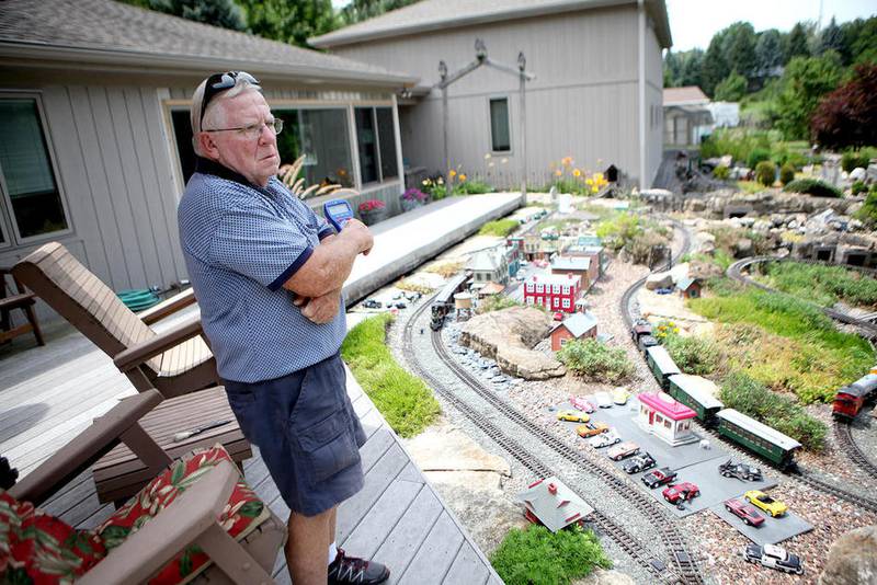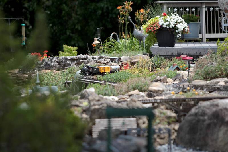 Cipcich’s railroad garden near Elburn, known as “The Blue Stone Ridge Railroad,” takes up 3,000 square feet of his backyard and includes three water features, a koi pond, live greenery, and a multitude of towns, churches, industrial buildings and cars placed all around the railroad garden.