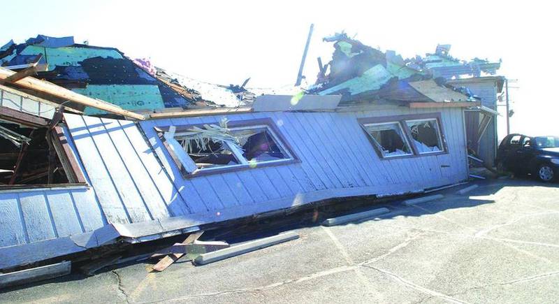 The restaurant, several vehicles in its parking lot, and several nearby homes were smashed by the twister before it moved on toward Fairdale, destroying farm buildings and homes along the way.