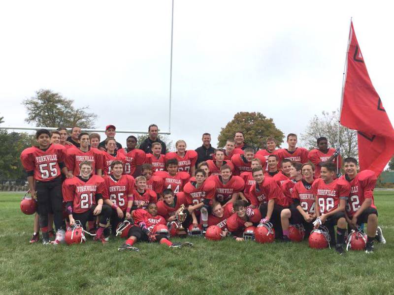 The Yorkville Middle School 8th grade football team won its third consecutive Fox River Prairie Conference championship. The Foxes downed Geneva 14-0 in a muddy semifinal contest before beating St. Charles Thompson 14-6 in the championship game. The team finished the year with a 9-1 record in A games, and a 1-1 record in B games. Leading scorers on the season included Doug Burson with 13 total touchdowns and Cole Yearsley with nine. Luke Davies completed 12 touchdown passes and Chase Divito had five touchdown receptions over the course of the season.