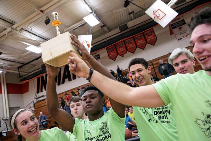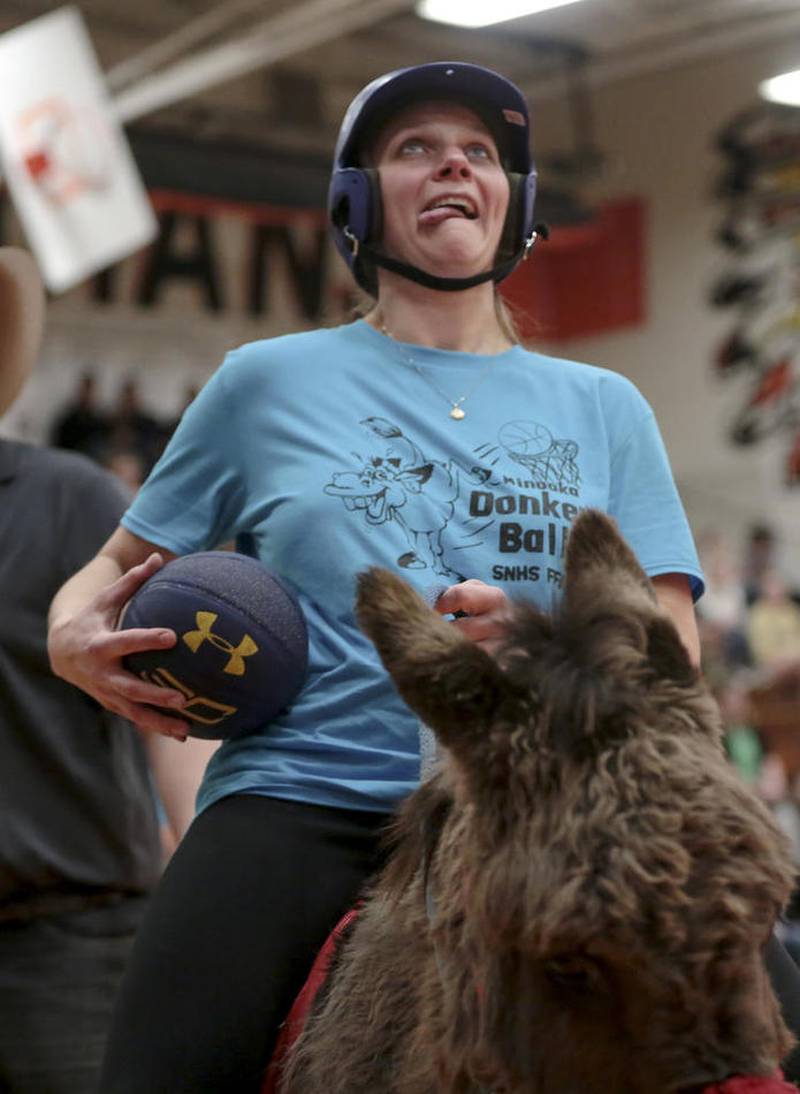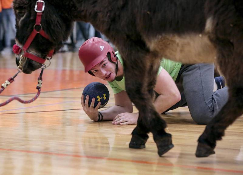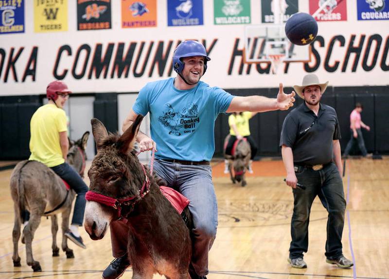 MINOOKA – Dozens of students and faculty members from Minooka Community High School saddled up Monday to compete in a Donkey Basketball Tournament to benefit the Mark Smith Legacy Fund. While the scores never broke more than two digits, the crowd roared with every shot and miss.
