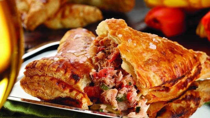 Cooked, flaked salmon, chopped cooked shrimp or drained canned tuna can be substituted for the crabmeat. The unbaked empanadas can be wrapped in plastic and frozen for up to 1 month. Bake from frozen increasing the time by 10 to 15 minutes.