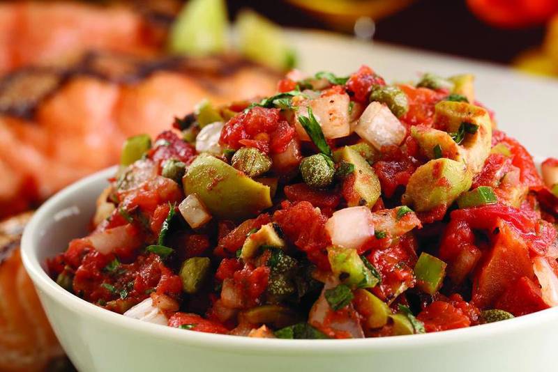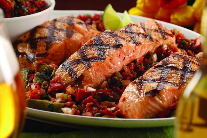 GRILLED SALMON WITH VERACRUZ TOMATO OLIVE SALSA AND POBLANOS