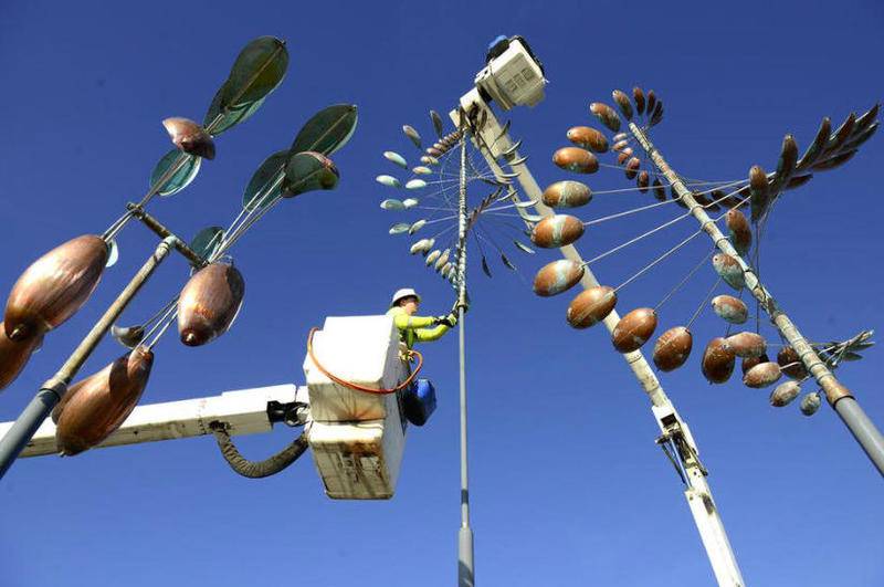 The River Corridor Foundation gave the city the sculpture, located on the west side of the Fox River just north of Hotel Baker. Installed in March, it features three poles, the tallest being 29 feet. On top of the poles are wind-driven, kinetic pieces that move in a synchronized manner, illuminated at night by lighting underneath.