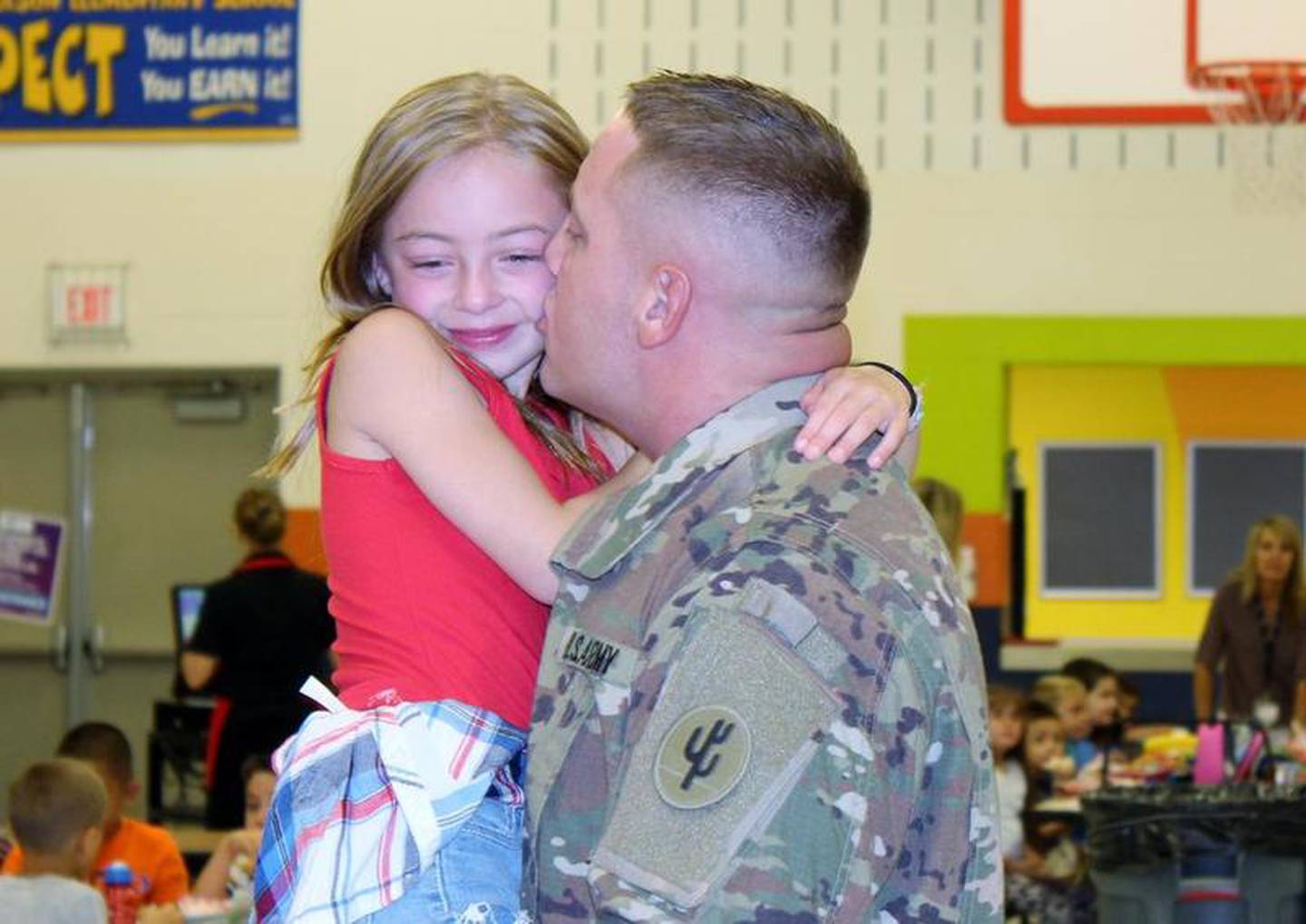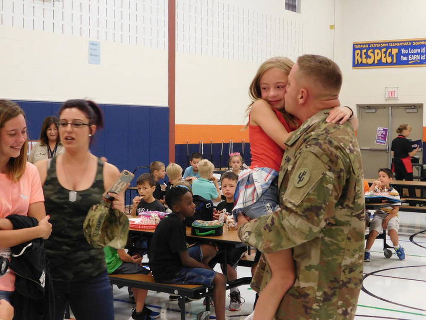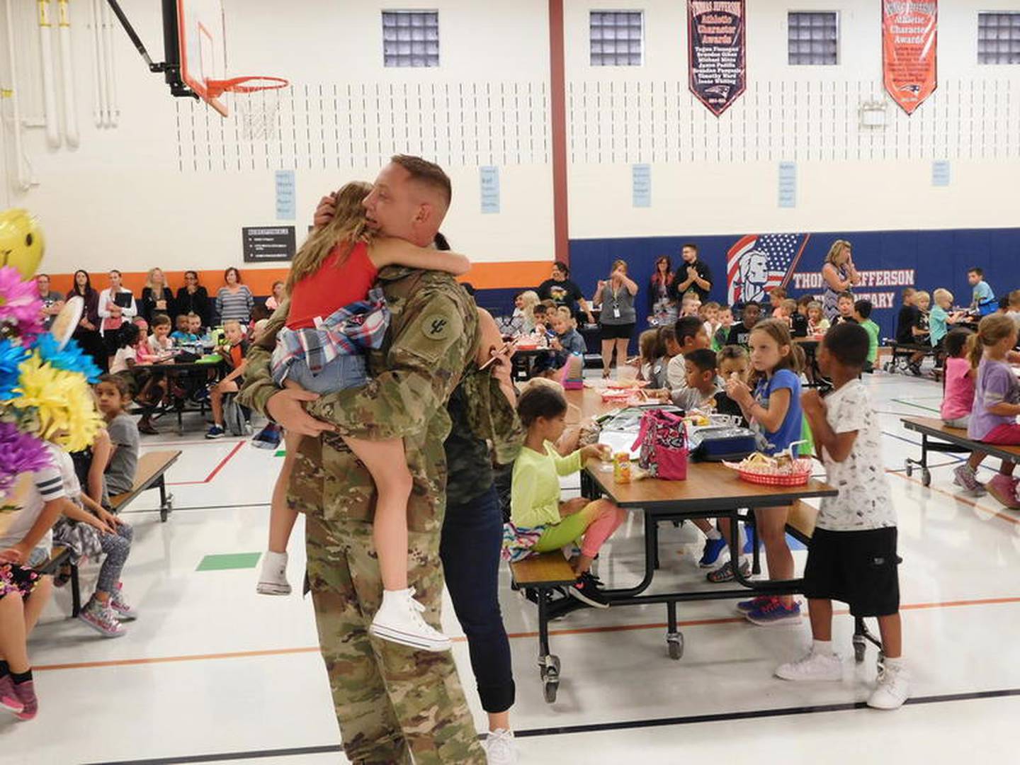 A local father surprised his daughter at school after being deployed for about a year. U.S. Army Sgt. Brian Campbell has been in the service for 12 years. He’s been on his most recent deployment since Oct. 1, 2016, in Kuwait, said his wife, Carmela Campbell. He was scheduled to originally come home in November, but that changed and Brian and his wife thought it would be the perfect opportunity to surprise their daughter, Vincenza. While Vincenza ate lunch with the other second-graders at Thomas Jefferson Elementary School, her father waited on the other side of the gym behind the divider curtain. (Megan Schuller)