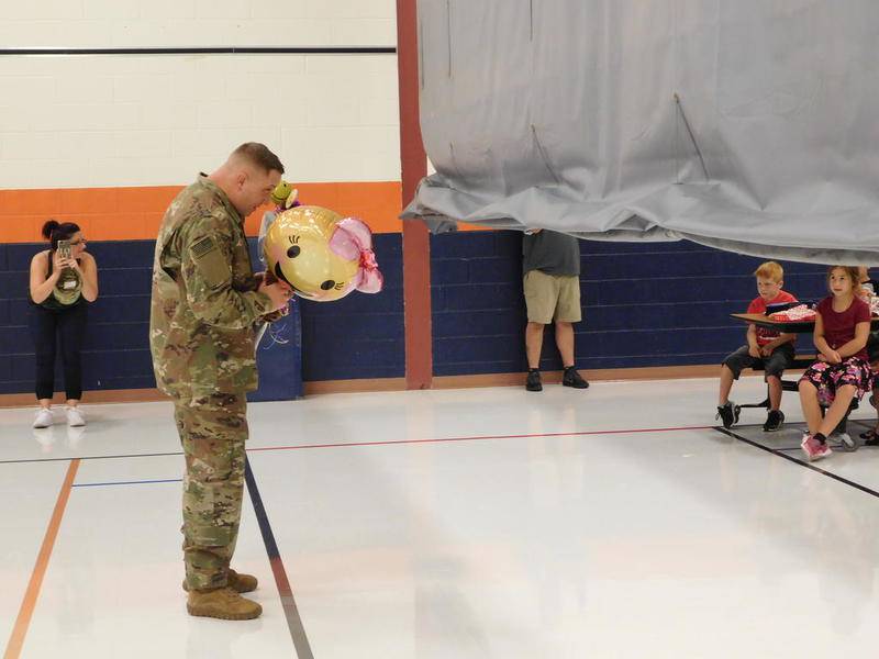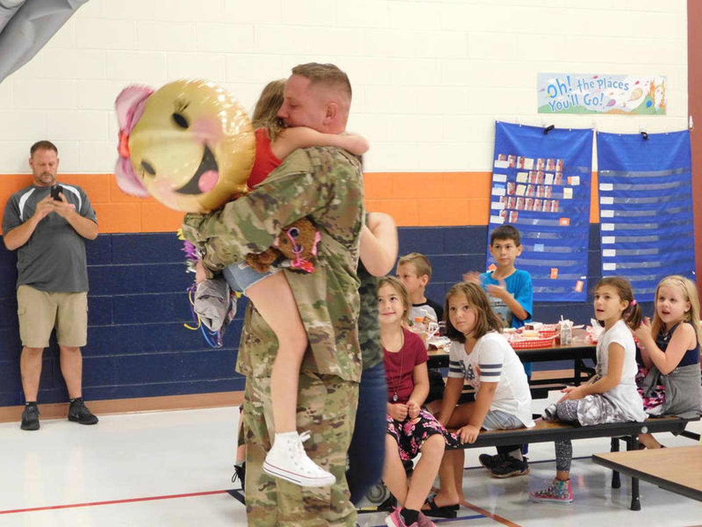 “We have a special guest who hasn’t seen somebody in a really long time. That special guest is here today to see that special person,” Principal Kristen Smith said before she raised the curtain to reveal Brian in uniform standing there with flowers and a balloon. Vincenza ran into her father’s arms as the teachers and classmates clapped and cheered. “It feels great to be with her, to be back here,” Brian said as he held his daughter. The second-grader didn’t leave her father’s arms. Vincenza said she was glad to have her dad home and shared what she wants them to do together first. (Megan Schuller)