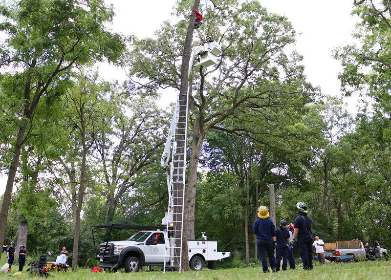 The man had been taking down the tree with a chainsaw and suffered an injury that left him unable to climb back down, Parker said.