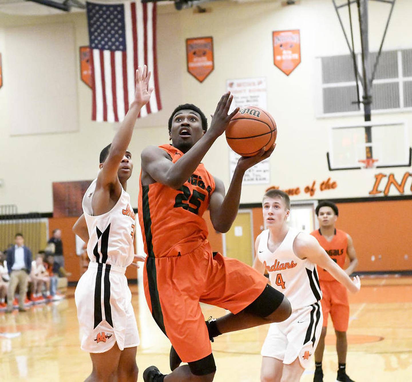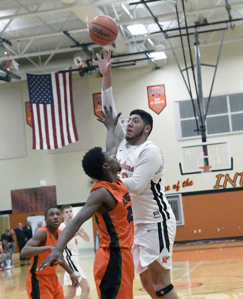 With 6:21 left, Kyle Graebner buried his second 3 of the game to pull the Indians within 47-42. Keegan Graebner picked up the first of his three fourth-quarter steals and fed senior guard Brandon Hill, cutting the East lead to 47-46 with 4:25 left. Hill finished with a game-high 21 points and hauled down six rebounds. “This was a great win for us tonight,” Hill said. “We never quit. I played well tonight and want to give credit to my teammate Grayson Hoffman (two points, nine rebounds) for a great pass that led to my final basket.” (Minooka's Adrian Gutierrez shoots over East's Collin Reed. (Larry Kane for Shaw Media))