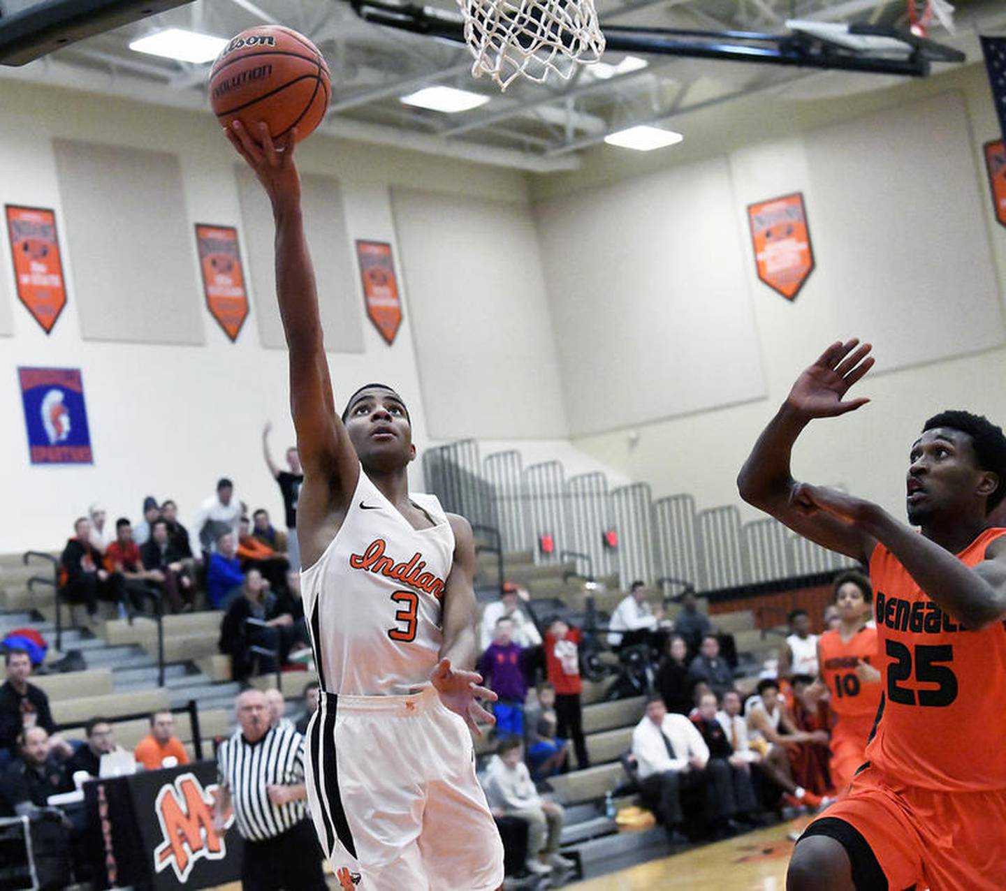 The Bengals were led by Nick Smoldt, who had 12 points, including two 3-pointers off the bench. East nailed six 3-pointers in the first half to take a 30-26 lead at the break. “We played well but just couldn’t finish at the end,” Smoldt said. “I came into the game with the idea to give us some energy off the bench.” (Minooka's Adrian Paige take the ball to the basket.)