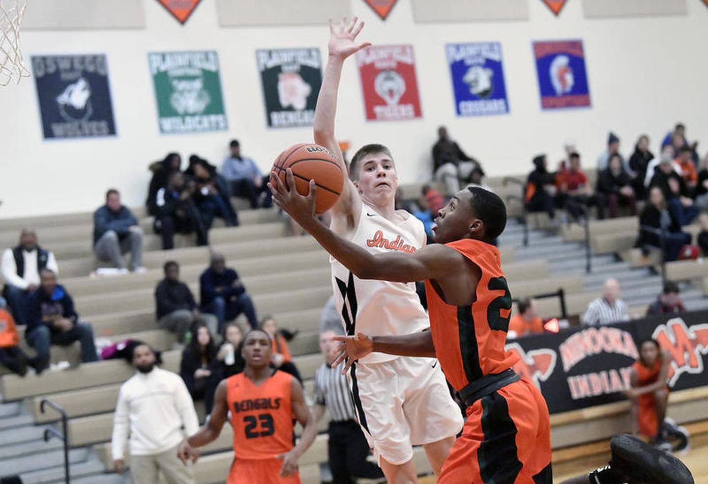 The Bengals will return to SPC play next Friday at home against Oswego (1-8, 0-3). “We won four games all last year and we have won four already this season,” Plainfield East first-year coach Mike Fowler said. “We played well for the most part tonight but we are learning how to close games out. We have a lot of basketball left to improve in this area.” An SPC battle for third place will take place next Friday when the Indians travel to Plainfield North (4-4, 2-1). (Minooka's Kyle Graebner tries to block the shot of Plainfield East's Kyrell Daniel.)