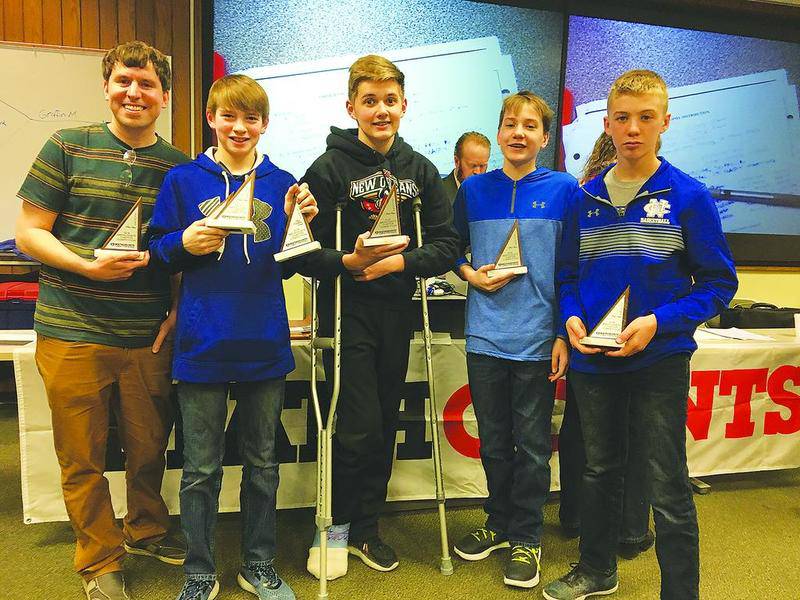 St. Mary School in Sterling’s Mathcounts team finished second in a tournament Feb. 10 at Sauk Valley Community College in Dixon. With their trophies are (from left) Ryan Sotelo, coach; Griffin Moran, third in individual competition and March 3 state competition qualifier; Koda Brininger, seventh overall; and Ethan Preuss and Brennen Cook. Photos submitted by Robbin Clifton.