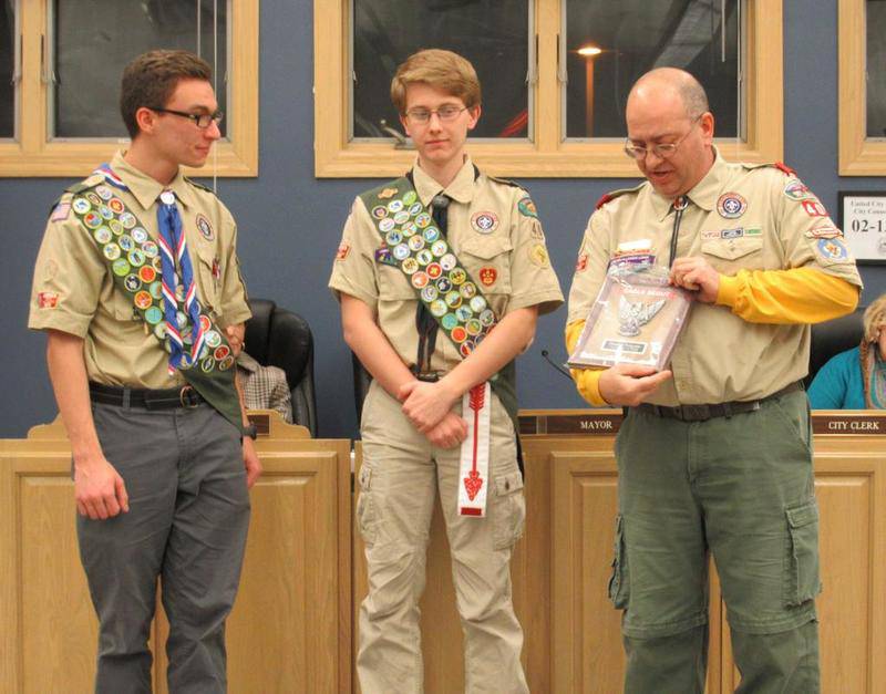 Yorkville Mayor Gary Golinski, far right, and the City Council honored two Eagle Scouts at the council meeting Tuesday evening, Feb. 13. Eagle Scouts Hunter Negron, left, and Sean Golinski were recognized for their accomplishments in becoming Eagle Scouts. Gary Golinski serves as scoutmaster for Yorkville Troop 40, and Sean is his son. Both scouts received a plaque. Negron said his Eagle Scout project was to paint the ceilings in the Chapel on the Green with help from some fellow scouts. Golinski said his project was to build a pergola at Yorkville's Riverfront Park with a group of scouts.