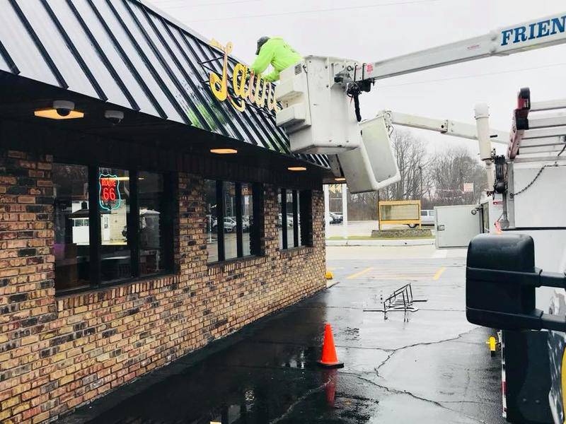 Co-owner Holly Barker, who, with her partner Tully Garrett, bought the Launching Pad and the Gemini Giant last year, said Friendly Signs from Kankakee approached them to donate the new sign. The old one was made out of plywood was falling apart. A Facebook post said the sign was a replica in every way.