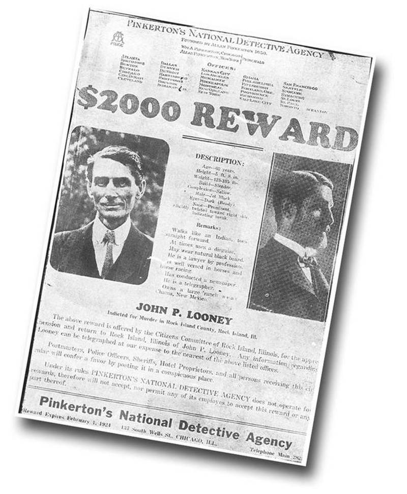 Federal prohibition authorities joined state, county and city law enforcement officers in an anti-vice campaign aimed at cleaning up the community. Looney was captured Nov. 30, 1923, in Belen, New Mexico, and returned to Rock Island. He was sentenced to prison for conspiracy and the murder of Gabel. Looney was released from prison in ill health April 7, 1934, at age 68 and never heard from again. He died March 4, 1942.