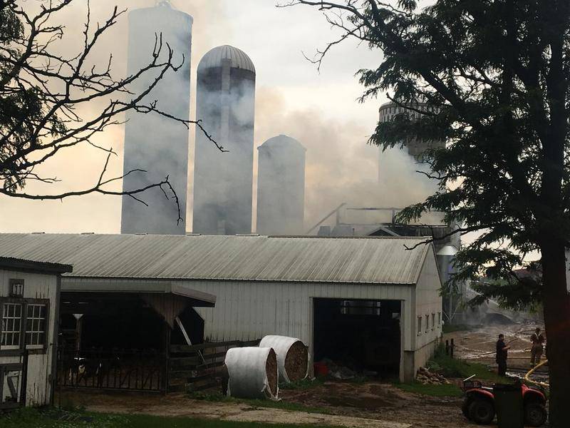 Cattle trailers joined fire trucks on the property to take the farm’s cows to the Kooistra Dairy Farm in Woodstock. None of the 93 cows were harmed, and no people were injured, but the barn was a total loss, officials said.