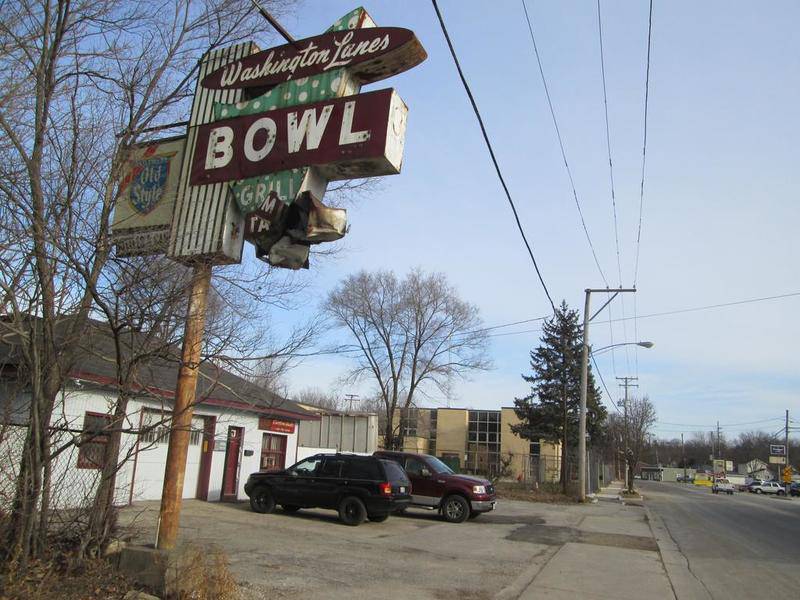 The bowling alley is long gone, but still standing is the Washington Lanes Bowl sign.