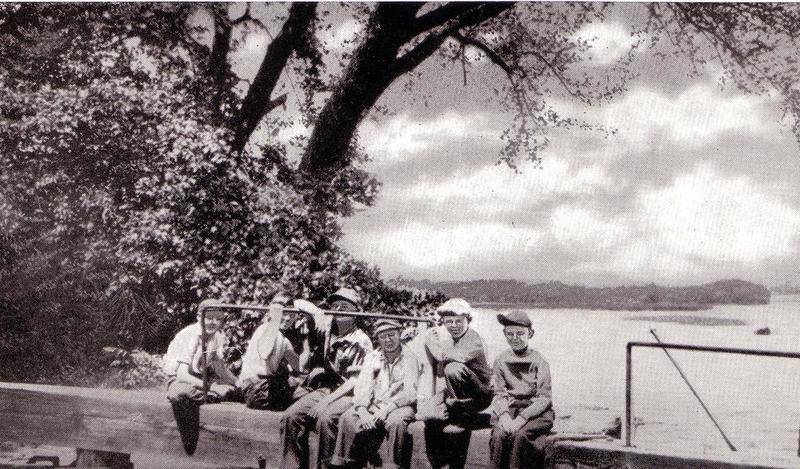 The Then photograph shows a view of the northern portion of Lock No. 7. Notice the six young children sitting on the large wooden beam. These large tapered beams, called balance beams, are long arms projecting from the landward side of the lock gate over the towpath. These heavy wooden timbers were attached to the top of the lock gate and chamber lock wall.