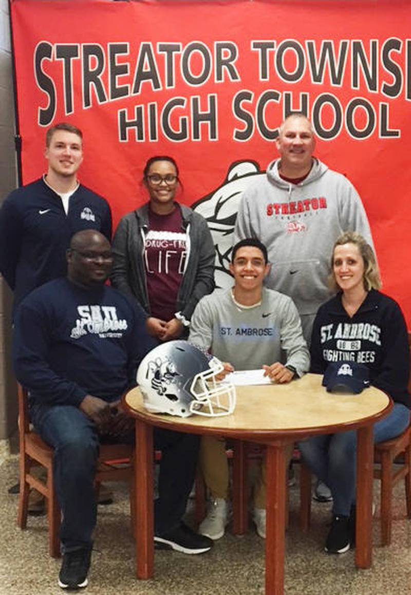 Streator High School senior Kobie Webb (seated at center) has signed on to continue his education in Davenport, Iowa, at St. Ambrose University and his football and track and field careers at the NAIA level with the Fighting Bees. Seated with Kobie are his parents, Nathaniel and Rachael Webb.