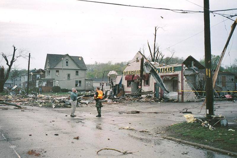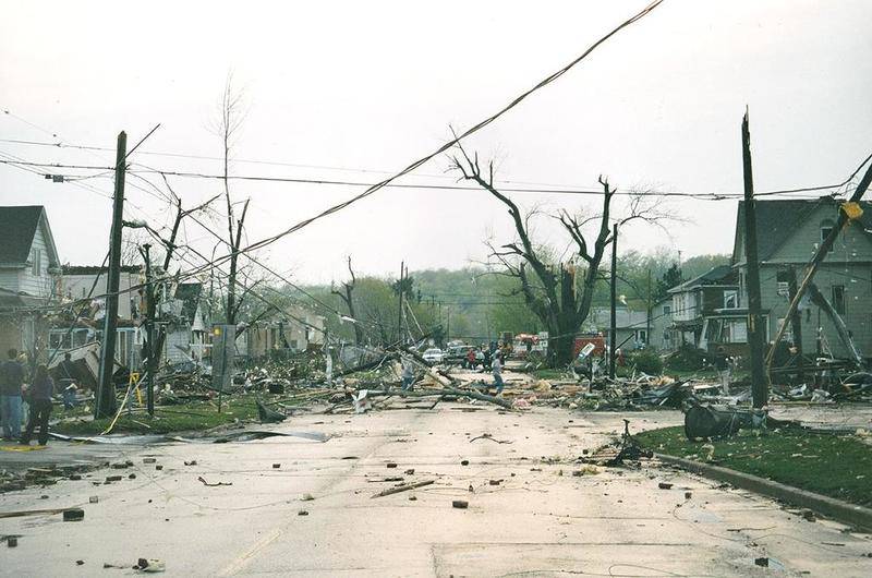 Like giant broken spider webs, power and phone lines crisscrossed the debris-littered streets. Houses, cars, garages and their contents were twisted and thrown into bizarre shapes. Roofs of buildings had been blown off by what the National Weather Service later reported were winds in excess of 200 mph. Shredded pieces of pink and yellow fiberglass insulation dotted yards as far as you could see. Dozens of utility poles were snapped in half.