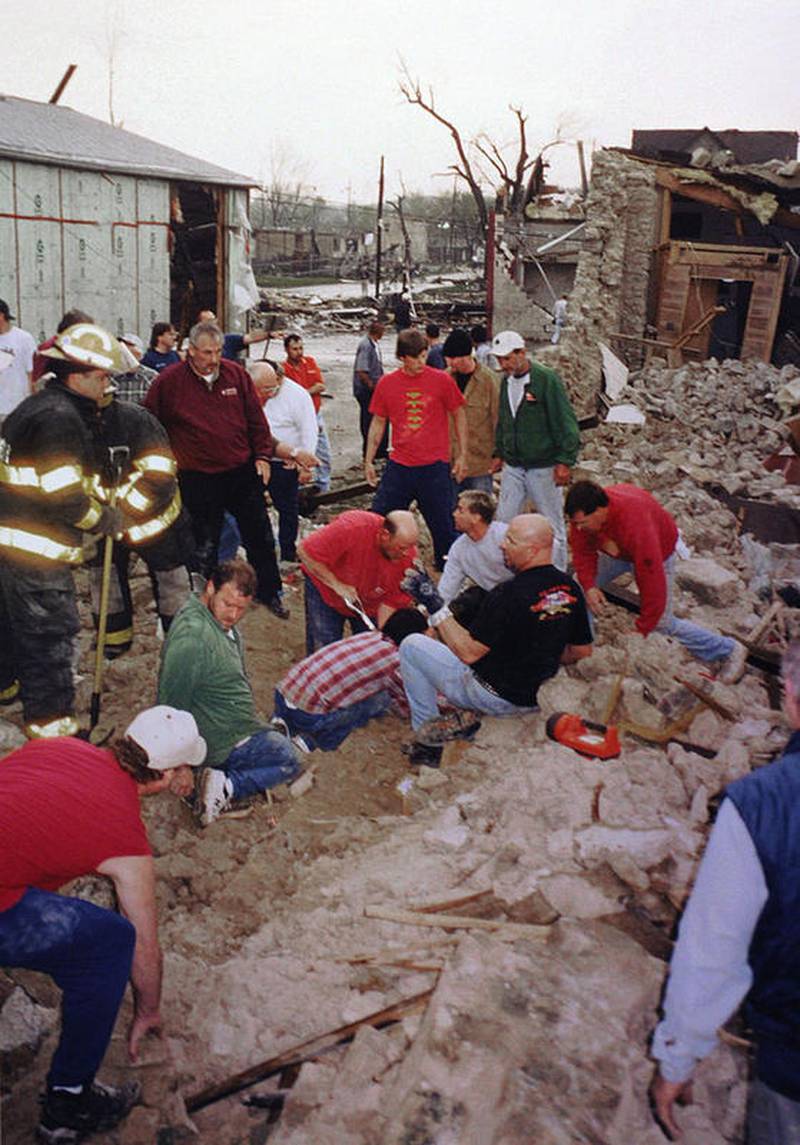The emergency lights over the Milestone site were strategically positioned to illuminate the continuing efforts of the search teams. And, as more and more North Central Illinois fire departments converged on the village, sheer manpower was no longer a problem for the rescuers in their delicate work. Dozens of professional emergency and disaster response teams from more than 30 fire departments came from as far away as Chicago in just a few hours.
