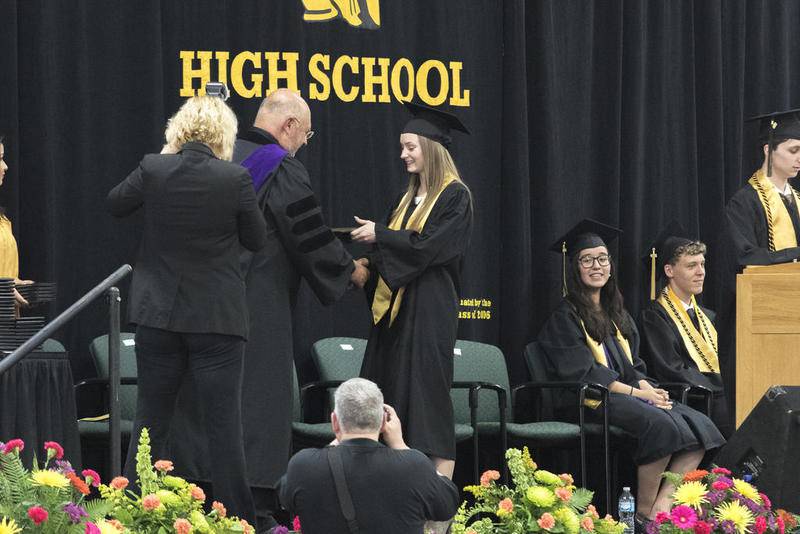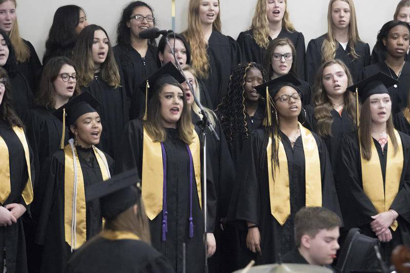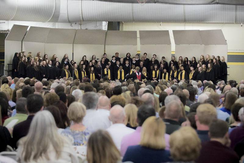 From the high school choir’s performance of Adele’s “When We Were Young,” to the moment in student speaker Allison Vidales’ remarks when she passed the mic to a piano-set recording of her classmates’ talking about the proudest moments of their high school careers, the humid afternoon in the high school fieldhouse actively emphasized student perspectives.