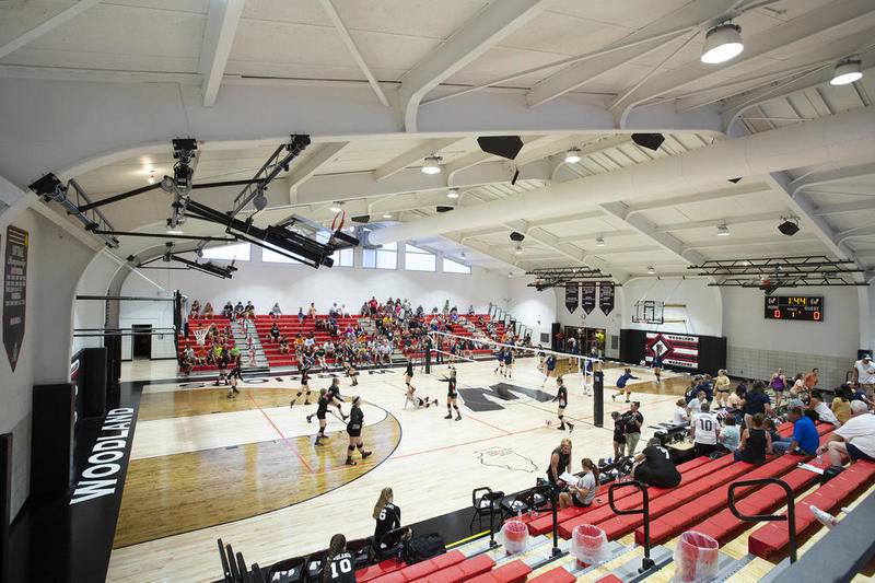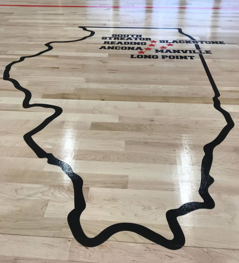 From the color of the walls to the gym floor itself, the basketball baskets to the bleachers, almost everything has a brighter, sharper, more-inviting feel. That includes the large "W" in the center of the floor and the smaller secondary logos facing the bleachers on both sides marking the main communities which make up Woodland — South Streator, Blackstone, Reading, Ancona, Manville and Long Point — with red stars on a map of Illinois.