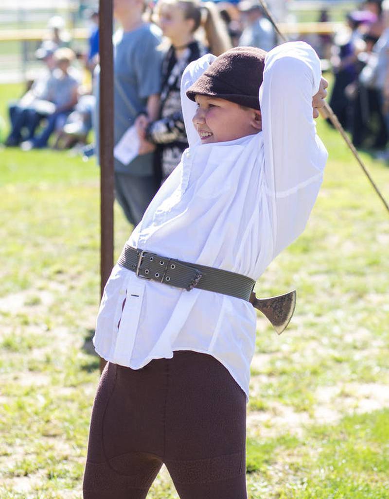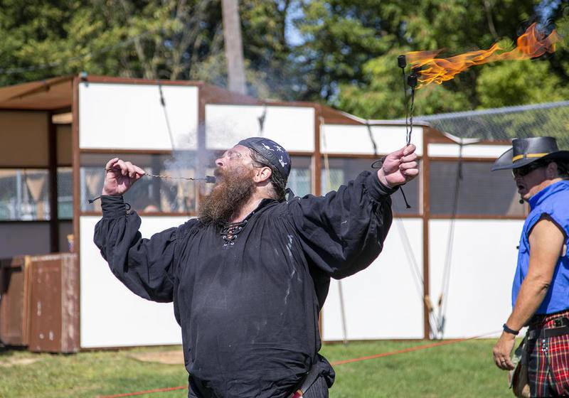 Capt. Rapier Wit demonstrates his fire-eating skills Saturday at the Marseilles Renaissance Faire. About 30 people gathered for his act at the fifth annual event at Guthrie Park. As the captain solicited donations he jokingly told the crowd that if he did not collect enough money to return to his native Iowa he would stay in Marseilles, reproduce and teach his offspring his Pirate Fire act. (For The)