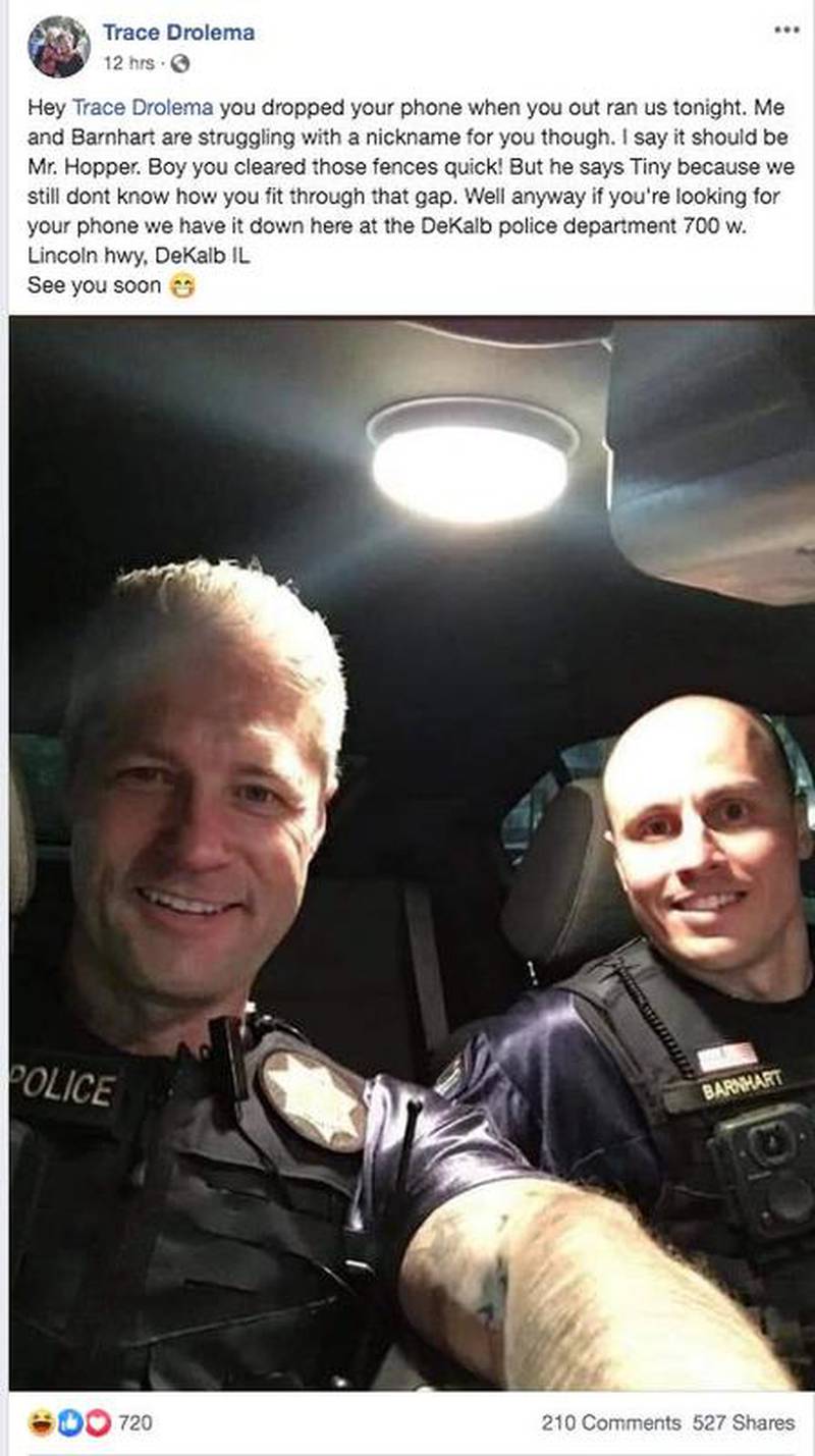 A post to a Facebook account under the name Trace Drolema included a photo of two police officers, and included text that read, "Hey Trace Drolema you dropped your phone when you out ran us tonight," and went on to talk about how the person had jumped fences to escape them and that the phone was now being held at the DeKalb police department.